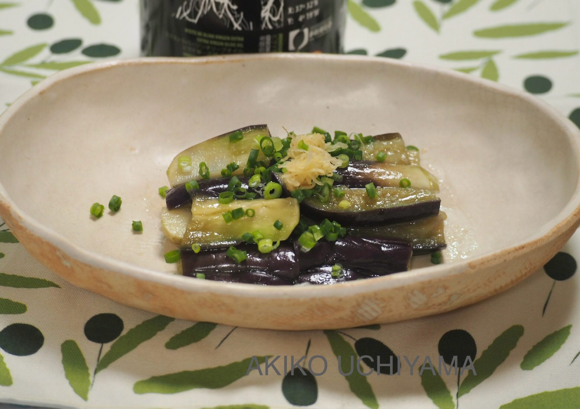 加熱後の茄子にオリーブオイルを絡める事でナスニンの流出を防ぎます。
